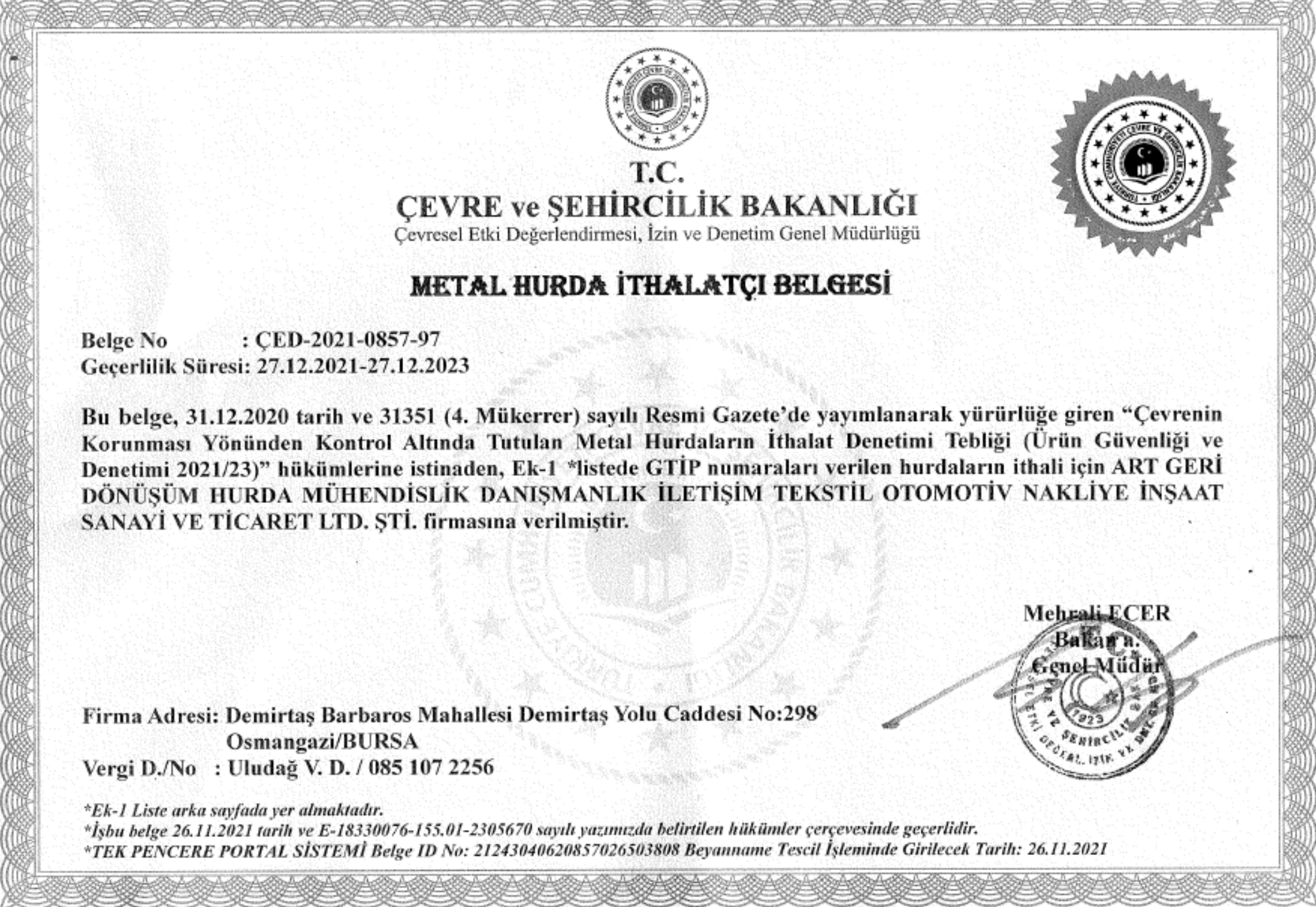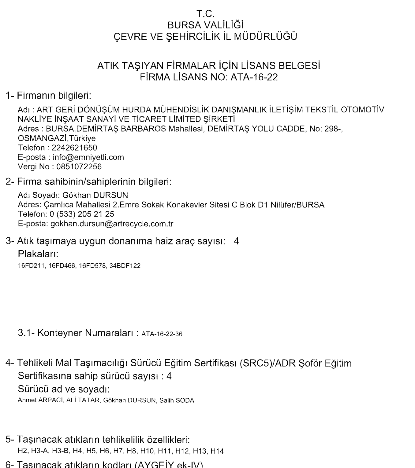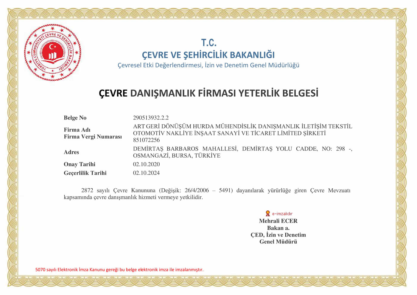 ART Recyle atık yönetiminin yanı sıra Çevre ve Şehircilik Bakanlığından aldığı yetki ile “Çevre Danışmanlık Hizmetleri” alanında da birçok firmaya hizmet vermektedir.